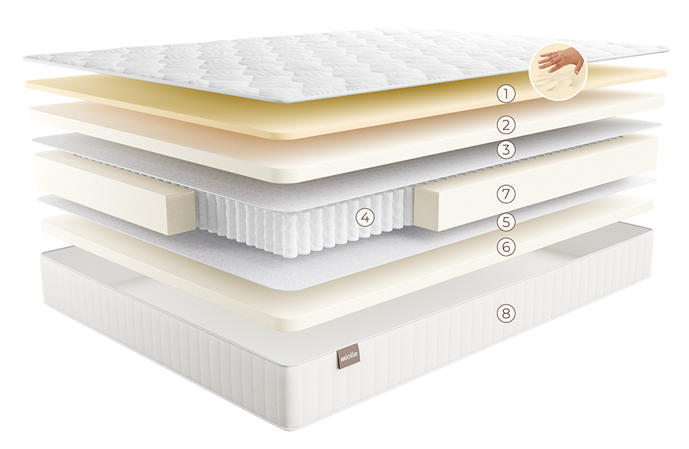 3. В центре — независимая пружинная система TFK S500, где каждая пружина работает автономно. Это обеспечивает точечную поддержку, исключает лишний шум и эффект волны, а также позволяет движениям партнера не беспокоить вас во сне (и наоборот). Этот слой изолирован натуральным хлопковым полотном с льняными нитями — экологичный защитный барьер предотвращает трение и износ, продлевая срок службы матраса.